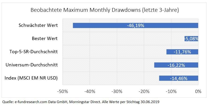 Aktiven Fonds wird zumindest in der Theorie nachgesagt, dass Sie insbesondere in Marktstressphasen einen Mehrwert gegenüber rein passiven Index-Investments ausspielen können. Ob auch Global Emerging Markets Equity Fondsmanager diesen vermuteten Mehrwert in den letzten 3-Jahren tatsächlich an den Tag legen konnten, hat e-fundresearch.com anhand der für das Analyseuniversum beobachteten Maximum Drawdowns (maximaler kumulierter Verlust) analysiert: