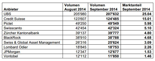 Top 10 Anbieter am schweizerischen Fondsmarkt (Beträge in Mio. CHF bzw. %)