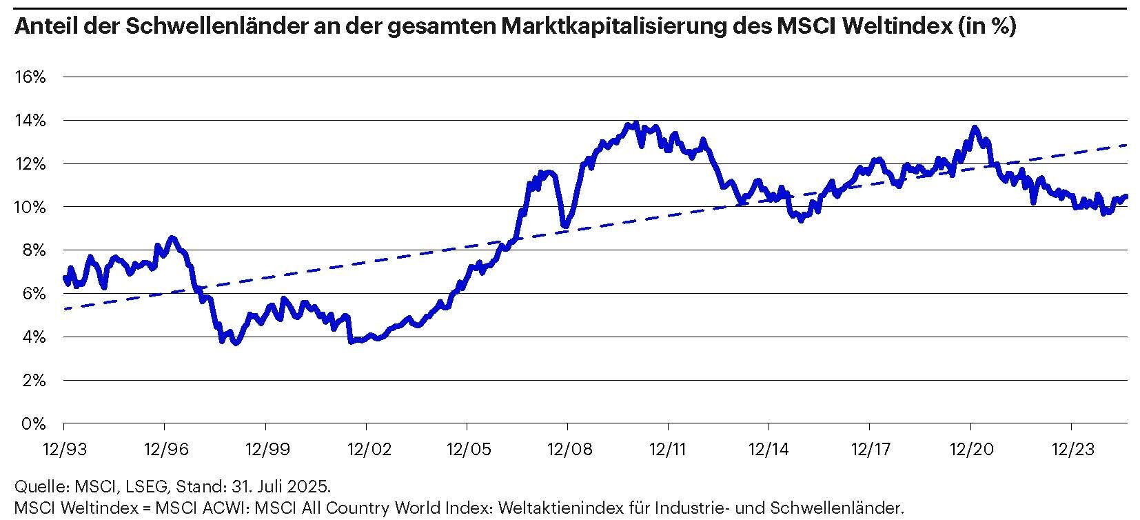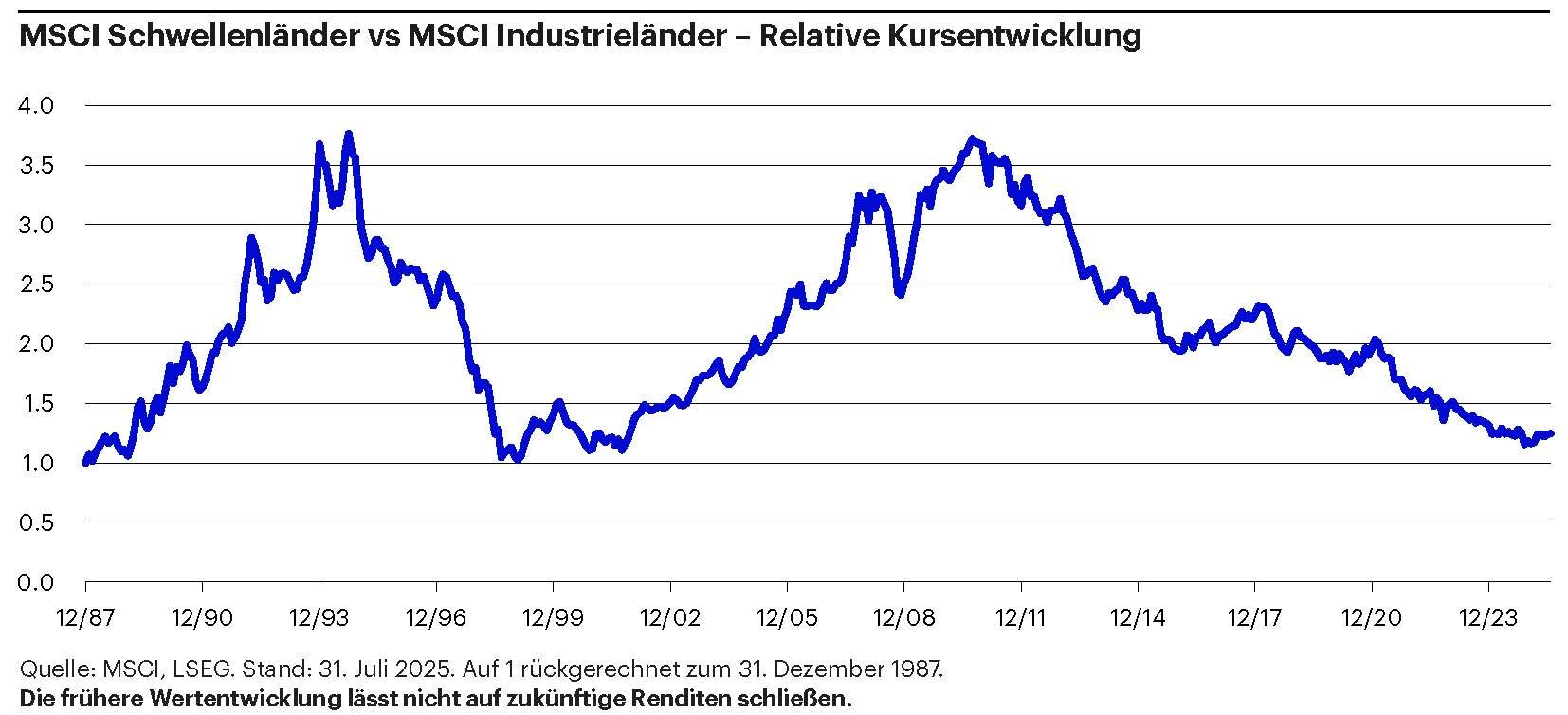 Im Jahr 2025 dagegen überzeugen die Schwellenländer durch ihre Outperformance. Die Frage ist nur: Ist das ein Wendepunkt oder weckt die starke Wertentwicklung falsche Hoffnungen? Fünf Katalysatoren sprechen dafür, dass tatsächlich ein struktureller Wandel zum Besseren stattfindet.