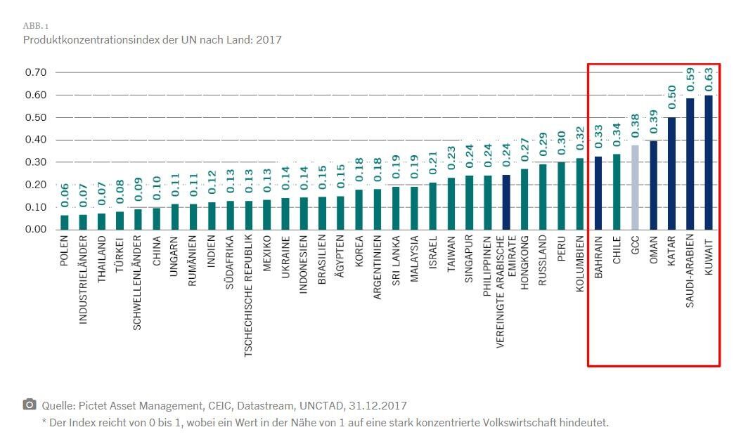Saudi-Arabien beherrscht den GCC wirtschaftlich mit einem Anteil von 44% am Gesamt-BIP. Die VAE machen 25%, Katar 14%, Kuwait 9%, Oman 5% und Bahrain 2% aus. Abbildung 1 zeigt, was alle GCC-Staaten gemeinsam haben: ihre Konzentration. Sie gehören laut UN zu den fünf der sechs am stärksten konzentrierten Volkswirtschaften*.