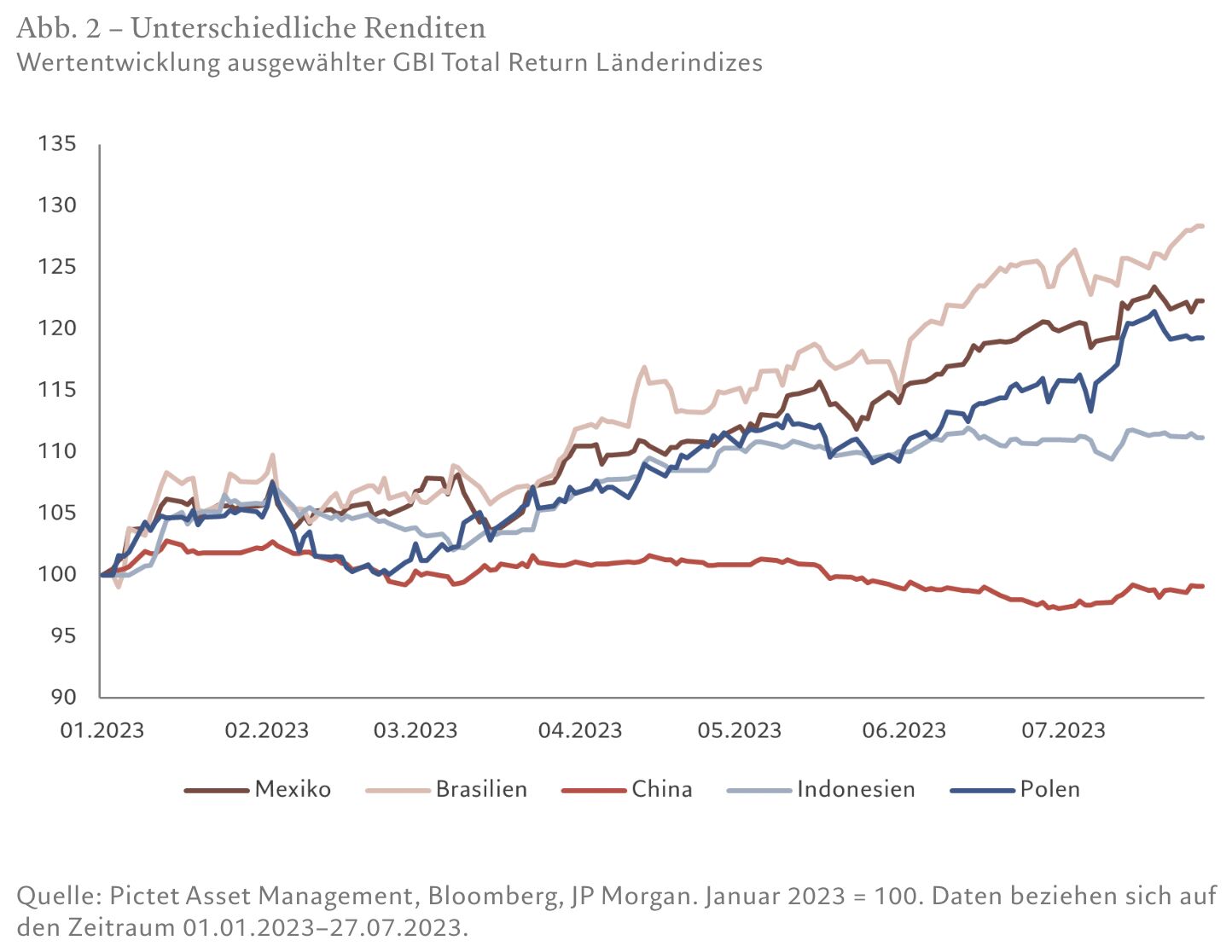 Der JP Morgan Local Sovereign Index (GBI-EM) hat seit Jahresbeginn um 10,5% in US-Dollar zugelegt, während der chinesische Index im gleichen Zeitraum um 0,7% fiel. Darin spiegelt sich die Währungsentwicklung wider – während beispielsweise die lateinamerikanischen Währungen in diesem Jahr eine Rally hinlegten, angeführt vom brasilianischen Real, hat der chinesische Renminbi gegenüber dem US-Dollar 3,3% verloren.2