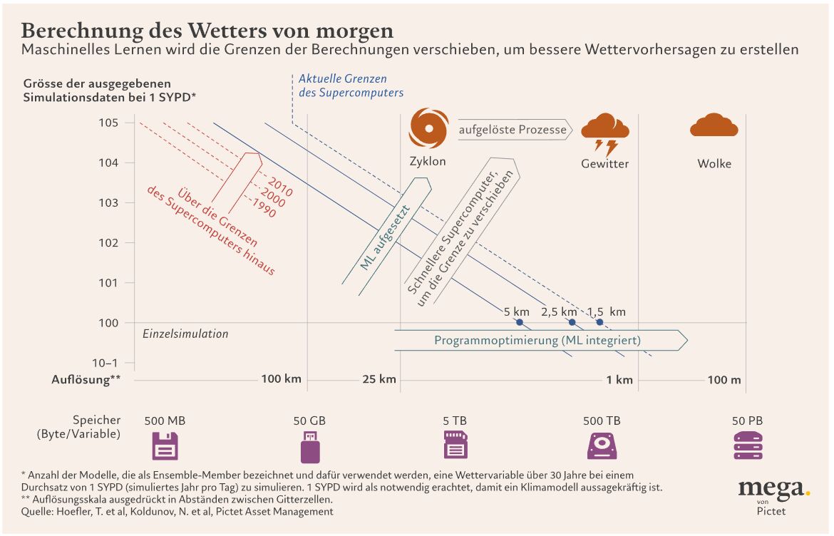 Es ist eine noch feinere Auflösung in einer Größenordnung von einem Meter erforderlich, um genau sehen zu können, wie sich Wolken bilden und entwickeln – was für die Wissenschaftler die größte Unsicherheitsquelle bei den Vorhersagen darstellt. Das ist bei einer herkömmlichen NWP-Methode nicht gerade günstig – Modelle mit einer Auflösung von 1 Meter benötigen 100 Milliarden Mal mehr Rechenressourcen als die heutigen fortschrittlichsten 1 km-Modelle.2