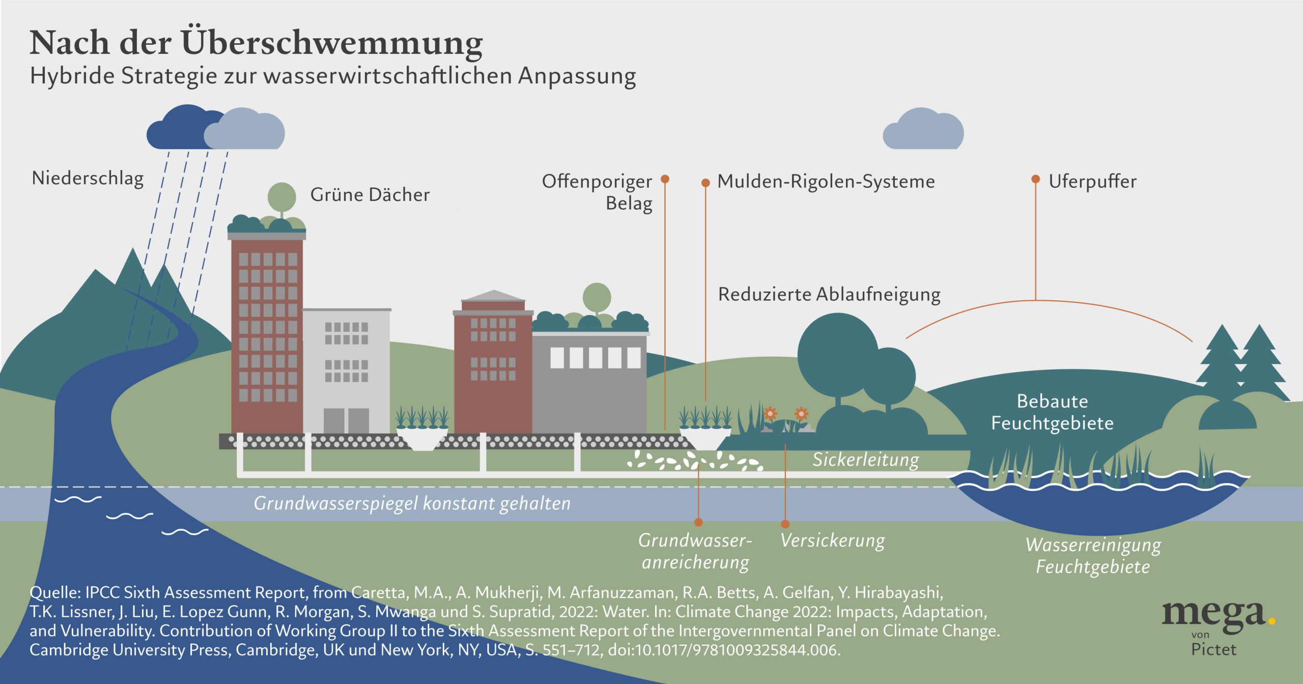 Dies könnte bedeuten: durchlässigere Oberflächen in den Städten, Bepflanzungspläne zum Schutz des Bodens, damit dieser mehr Wasser aufnehmen kann, die Wiederherstellung von Feuchtgebieten oder die Schaffung von unterirdischen Reservoirs, die kurzzeitig große Wassermengen aufnehmen können. Diese und verschiedene andere Maßnahmen wurden in von Sturzfluten bedrohten Städten wie Singapur, Rotterdam und Tokio erfolgreich umgesetzt.
