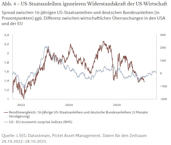 Gleichzeitig ist die US-Wirtschaft – trotz einer gewissen Abschwächung am Arbeitsmarkt – robust und der Inflationsdruck sollte nicht unterschätzt werden. Dies dürfte durch die zunehmende Bereitschaft der Banken zur Kreditvergabe im Zuge fallender Zinssätze untermauert werden. Tatsächlich scheint die US-Wirtschaft im Vergleich zur Eurozone in einer zunehmend guten Verfassung zu sein, was darauf hindeutet, dass der Renditeunterschied zwischen US-Staatsanleihen und deutschen Bundesanleihen überzogen ist (siehe Abb. 4).