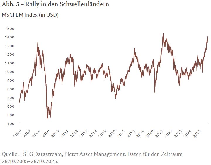 Das Universum der Schwellenländer profitiert von soliden wirtschaftlichen Fundamentaldaten. Bislang ist es den weniger entwickelten Ländern gelungen, die Auswirkungen der Zölle von Präsident Trump abzufedern. Die asiatischen Schwellenländer verzeichneten im bisherigen Jahresverlauf mit 32% die größten Zuwächse in Lokalwährung – und legten damit fast doppelt so stark zu wie der US-Markt –, aber auch Lateinamerika lag mit 30% weit vorn. In US-Dollar verzeichneten die Schwellenländer immer noch höhere Gewinne.