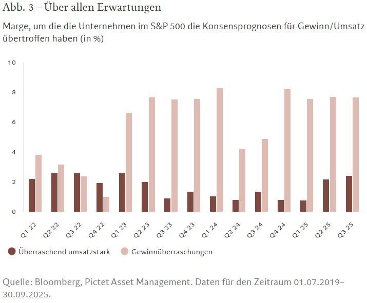 Die Unternehmen an den wichtigsten Aktienmärkten erzielen weiterhin hohe Gewinne – mehr als 80% der US-Aktien haben die Gewinnprognosen übertroffen. Trotz der starken Rally, die die Bewertungen in die Höhe getrieben hat, ist unser Ausblick für die Unternehmensgewinne weiterhin positiv.