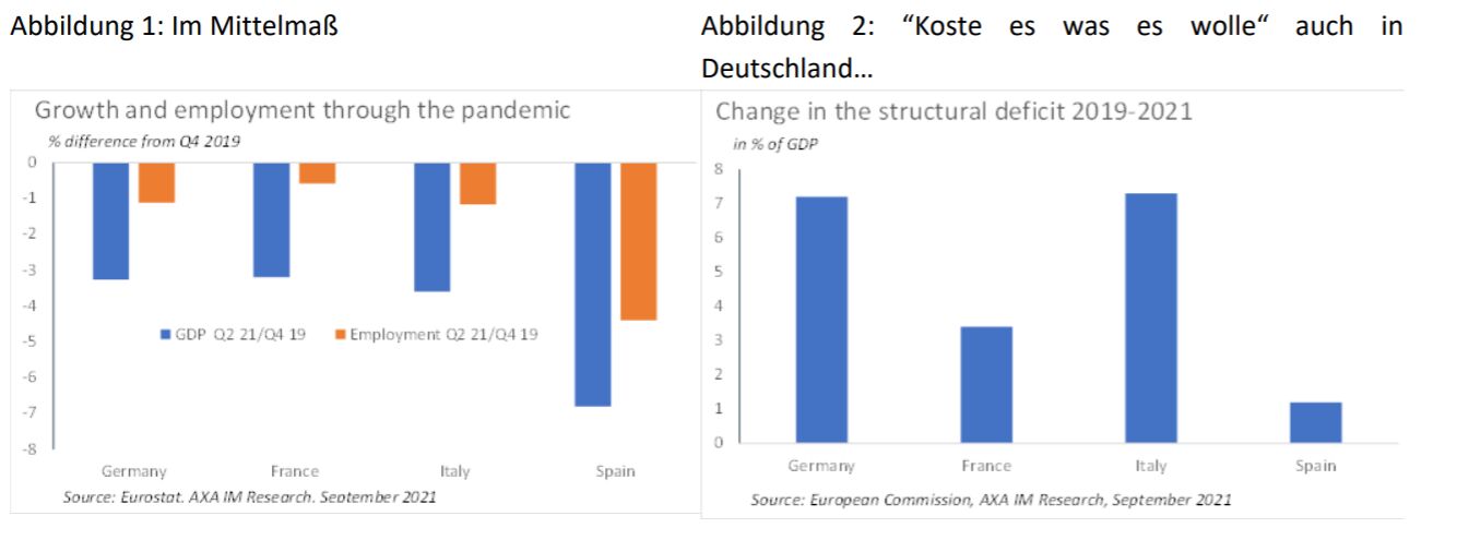 Deutschlands Wirtschaftsleistung seit Beginn der Pandemie ist im Gesamtvergleich mit Europa als durchschnittlich zu bezeichnen. Angesichts des deutschen Fokus auf die Fertigungsindustrie fiel der anfängliche Schock etwas gedämpfter aus als in den von der Dienstleistungsbranche dominierten Volkswirtschaften in Südeuropa. Über einen Zeitraum von sechs Quartalen war der Rückgang des Bruttoinlandsprodukts (BIP) in etwa so hoch wie in Frankreich und geringer als in Spanien, allerdings ausgeprägter als in Italien. Zwar konnte der Beschäftigungsverlust im Gegensatz zu den USA dank staatlicher Maßnahmen eingedämmt werden, doch auch hier ist die deutsche Gesamtleistung nicht außergewöhnlich (siehe Abbildung 1).