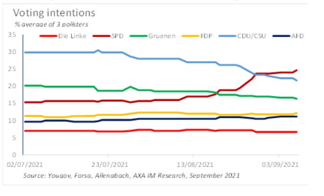 Mit Blick auf die anstehende Bundestagswahl gibt es nach den aktuellen Umfragen zwei mögliche Koalitionen, die bequem über 50 Prozent der Sitze im Bundestag erreichen könnten: Die Ampel (SPD + Grüne + FDP) und Rot-Rot-Grün (SPD + Die Linke + Grüne). Während also ihre Hoffnung auf die Kanzlerschaft selbst in den letzten Monaten geschwunden ist (siehe Abbildung 4), würden die Grünen es trotzdem in die Regierung schaffen, was darauf schließen lässt, dass die Dekarbonisierungs-Agenda nach dem 26. September einen hohen Stellenwert haben wird. Aber wir würden sogar noch einen Schritt weiter gehen: Unabhängig vom Ausgang der Wahlen hat sich Deutschland auf einen "Netto-Null"-Pfad festgelegt, der in jedem Fall einen starken Einfluss auf die Regierungspolitik haben wird.