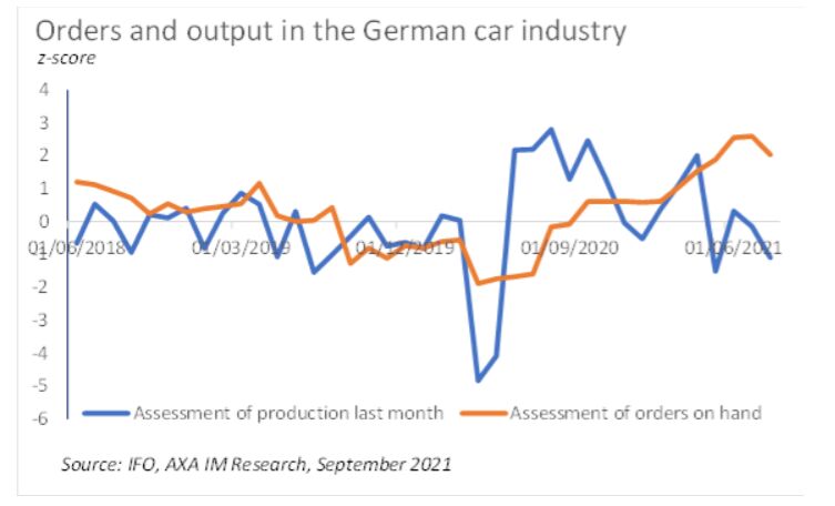 Nun könnte sich die deutsche Wirtschaft ob ihrer Abhängigkeit von der Fertigungsindustrie und der starken Einbindung in globale Lieferketten mit negativen Folgen konfrontiert sehen. Tatsächlich haben die Engpässe, z.B. bei den Seetransportkapazitäten oder den Mikrochips, erhebliche Auswirkungen auf die deutsche Industrie. So veranschaulicht Abbildung 3 die Konsequenzen der eben genannten Umstände auf die deutsche Automobilindustrie. Die große Kluft zwischen dem starken Auftragsbestand und der Produktion in der Umfrage des Instituts für Wirtschaftsforschung ifo zeigt: Deutschland mangelt es an Wirtschaftsleistung.