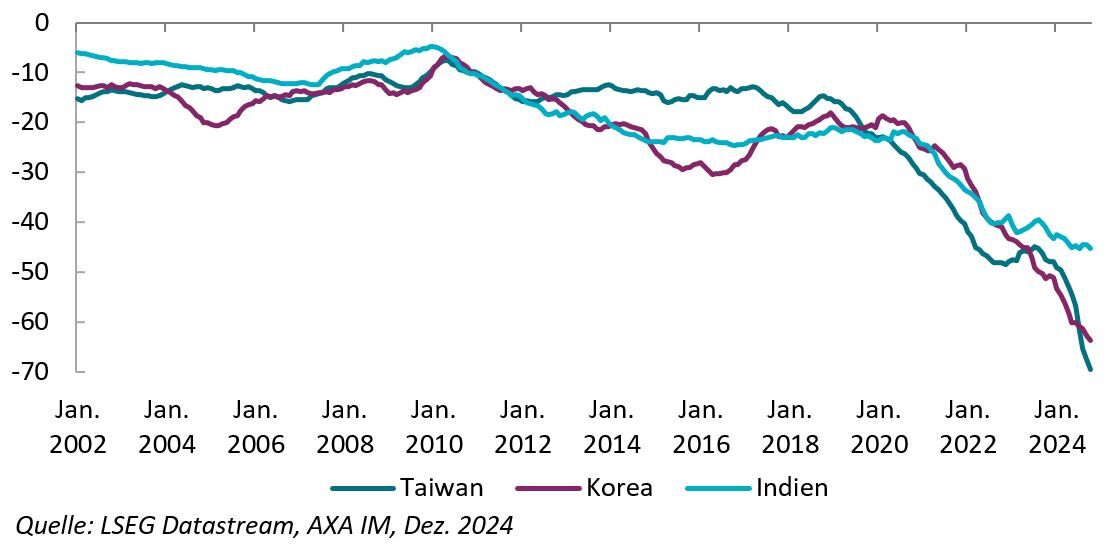 Sowohl die Nachfrage nach Hochleistungsrechnern als auch die Investitionen dürften anhalten, da in den Lieferketten mit Bezug zu künstlicher Intelligenz Kapazitäten aufgebaut werden. Exporte nicht technologischer Güter sind Gegenwinden ausgesetzt, und der Handelsbilanzüberschuss gegenüber den USA dürfte künftig auf den Prüfstand gestellt werden. Was die Geldpolitik betrifft, so wird die Wirkung einer möglichen Lockerung aufgrund von Hebeleffekten am Wohnimmobilienmarkt begrenzt.