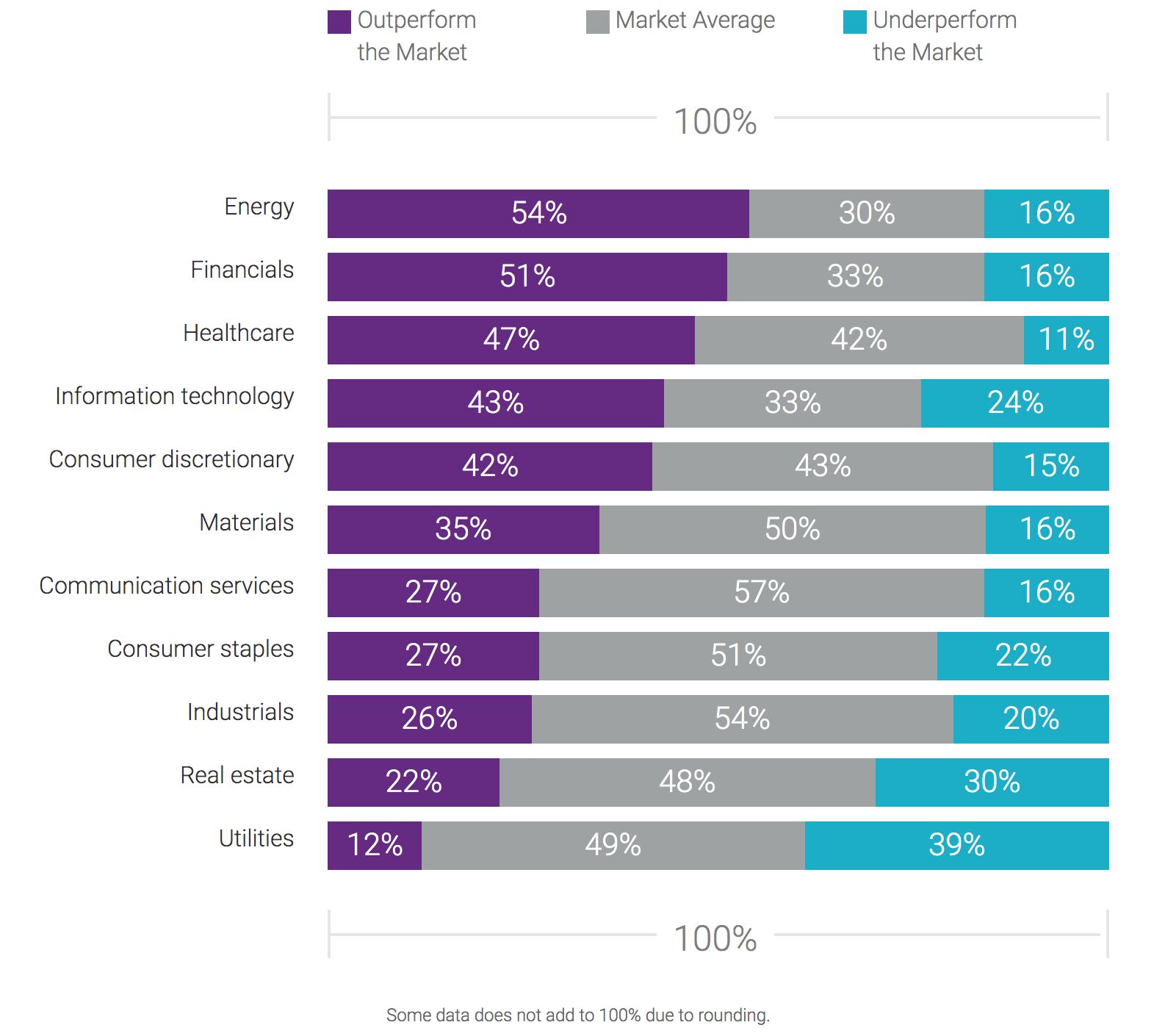 Was die Branchenallokation angeht, so gehen 54 Prozent der Fondsselektoren davon aus, dass der Energiesektor in diesem Jahr outperformen wird. Ähnliches gilt für Finanzwerte (51 %) und den Gesundheitssektor (47 %). Der Technologiesektor ist offenbar noch nicht abgeschrieben. 43 Prozent erwarten, dass dieser sich 2022 nach wie vor besser entwickeln wird. 65 Prozent der Befragten erwarten zumindest ein weiter anhaltendes Wachstum.