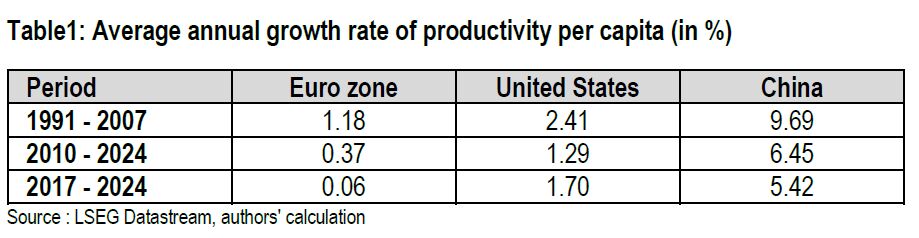 Artus: „Vor 2007 betrug der Produktivitätszuwachs in den USA 2,4% p.a., in der Eurozone 1,2% p.a. und in China 9,7% p.a. Jahr. Ab 2010 ging dieser Trend auf 1,3% in den Vereinigten Staaten, 0,4% in der Eurozone und 6,4% in China zurück. Trotz kontinuierlich gestiegener Ausgaben für Forschung und Entwicklung, schwächte sich – außer in den Vereinigten Staaten – das Produktivitätswachstum pro Kopf ab 2017 weiter ab (siehe Tabelle 1).