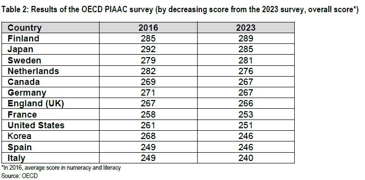 Den Kompetenzschwund in der Erwerbsbevölkerung macht der Professor an der Paris School of Economics (PSE) und ehemalige Chefvolkswirt der Investmentbank Natixis fest an der Internationalen PIAAC-Studie der OECD zur Untersuchung von Alltagsfähigkeiten Erwachsener (siehe Tabelle 2). Demnach hätten die Erwerbstätigen in den Vereinigten Staaten und in den größten europäischen Ländern zwischen 2016 und 2023 an Lesekompetenz, alltagsmathematischer Kompetenz und adaptivem Problemlösen verloren.