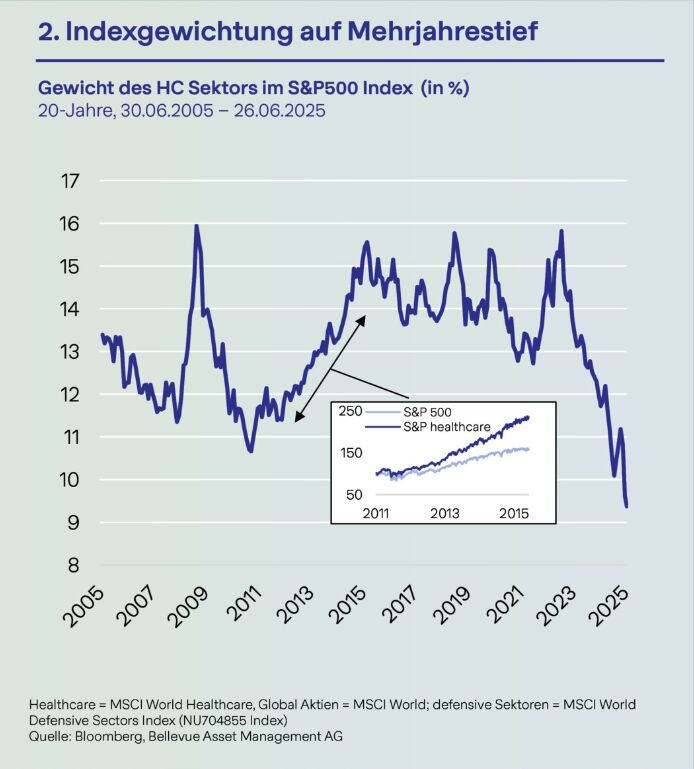 Mit weniger als 10% Gewicht am S&P 500 erreicht Healthcare den niedrigsten Stand seit über einem Jahrzehnt. Nach einer ähnlich tiefen Gewichtung im Jahr 2011 hat der Sektor den breiten Markt in vier Jahren um mehr als 70% übertroffen. Dabei bleibt Healthcare ein struktureller Wachstumssektor, der überdurchschnittlich von der Demografie, Innovation und stabilen Cashflows profitiert.