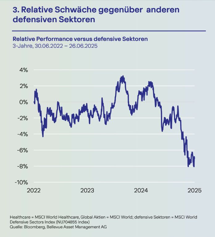 Seit Sommer 2024 hat sich Healthcare um mehr als 10% schlechter entwickelt als der MSCI Defensive Sector Index, der neben Healthcare auch die defensiven Sektoren Energie, Utilities und Basiskonsumgüter beinhaltet – dies trotz ungebrochener fundamentaler Stärke
