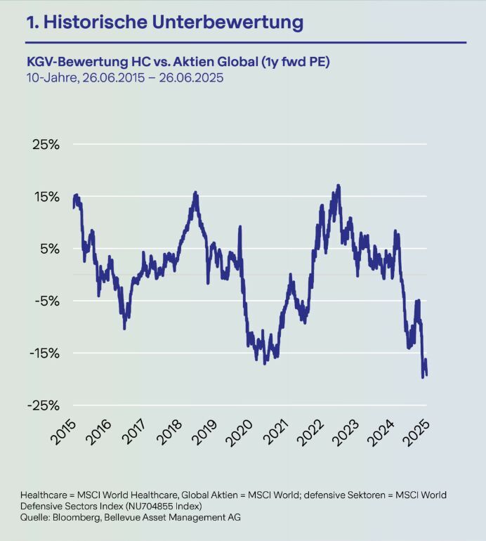 Der Healthcare-Sektor ist derzeit rund 20% günstiger bewertet als globale Aktien – ein Bewertungsniveau, das zuletzt vor fünf Jahren erreicht wurde.