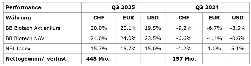 Nach einem volatilen 1. Halbjahr erzielte BB Biotech eines der stärksten Quartalsergebnisse der vergangenen Jahre. Der Reingewinn belief sich auf CHF 448 Mio. und markierte damit eine klare Trendwende gegenüber dem Verlust von CHF 157 Mio. im 3. Quartal 2024. Der Net Asset Value (NAV) stieg um 24.0% in CHF (EUR +24.0% / USD +23.5%), während der Aktienkurs um 20.0% (EUR +20.1% / USD +19.5%) zulegte – beide deutlich über der Performance des Nasdaq Biotech Index (+15.6% in USD). Das Ergebnis resultiert aus einer überzeugenden Portfolioentwicklung, einer wiedererstarkten Branchendynamik und einer zunehmenden M&A-Aktivität, die Kapital an die Investoren zur Reinvestition zurückführt.