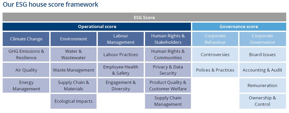 Wir haben daher einen eigenen ESG House Score ergänzend zu unseren Analysen entwickelt. Unser System stützt sich überwiegend auf Rohdaten von Drittanbietern, berücksichtigt aber auch die aus unserer Sicht relevanten Faktoren für einzelne Sektoren, Regionen und Firmen.
