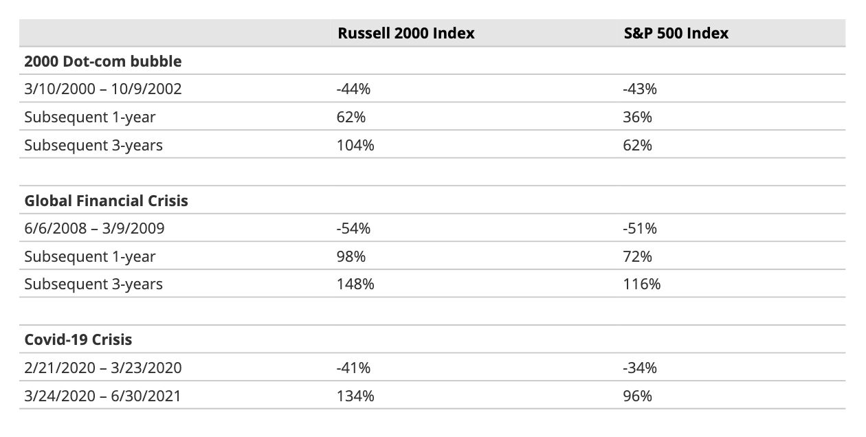 Aus diesen Gründen sind kleinere Unternehmen vor allem bei Marktabschwüngen gefährdet. Bei den meisten Marktrückgängen in der Vergangenheit wurden die Kurse von Small-Cap-Aktien stärker in Mitleidenschaft gezogen als jene von Large-Cap-Titeln. Zu Beginn der Pandemie, als die Märkte einbrachen und sich die Konjunkturaussichten eintrübten, mussten Small Caps erwartungsgemäß stärkere Verluste hinnehmen als ihre Large-Cap-Pendants.