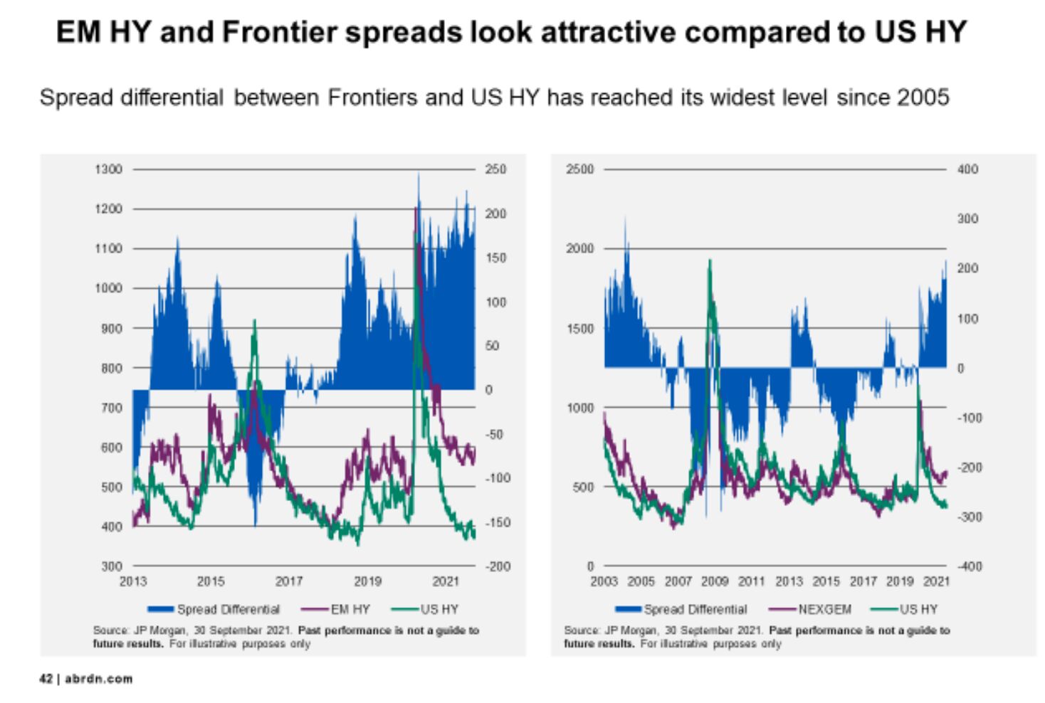 Aber was ist mit Hochzinsanleihen aus den Schwellenländern/Anleihen der Frontier Markets? Profitieren diese Märkte nicht in der Regel von höheren Ölpreisen? Das ist richtig – doch scheinen sie es in diesem Jahr nicht mitbekommen zu haben. Ein weiterer Faktor ist die sehr reelle Angst vor einer Verlangsamung in China. Exporteure aus den HY-Schwellenländern/Frontier Markets weisen eine deutlich stärkere Abhängigkeit von China auf als ihre US-Pendants. Berücksichtigt man zudem die hohen Kosten der Bekämpfung von Covid-19, wird klar, warum Unternehmen aus den HY-Schwellenländern/Frontier Markets trotz der steigenden Ölpreise unterdurchschnittlich abgeschnitten haben.
