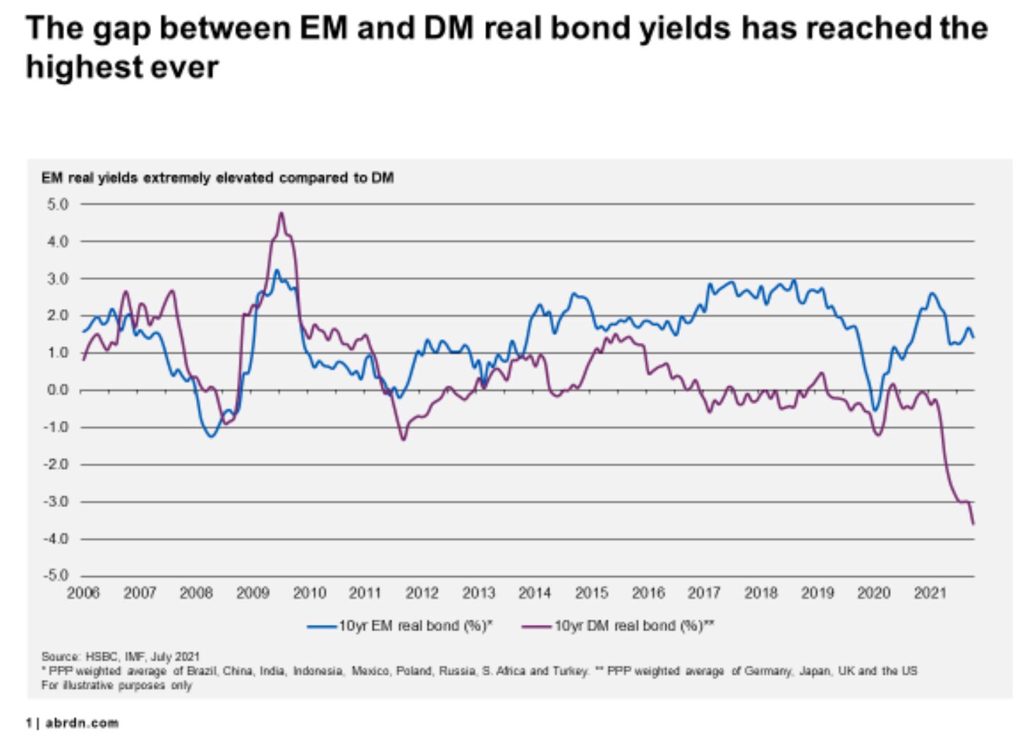 Zugegebenermaßen, es spricht nur wenig dafür, dass eine hohe Zahl ausländischer Anleger in Schwellenländeranleihen drängen wird. Ein Pluspunkt der Anlageklasse sind aber deren Bewertungen. Wie aus der Grafik hervorgeht, hat der reale Zinsunterschied zwischen den Schwellen- und den Industrieländern historische Niveaus erreicht. Die realen Renditen 10-jähriger Schwellenländeranleihen bewegen sich beinahe genau in der Mitte ihrer historischen Spanne. Dagegen fallen die realen Renditen entsprechender Papiere aus den Industrieländern so negativ aus wie noch nie zuvor. Was die Inflation anbelangt, so kam es 2021 zu einem angebotsseitigen Jahrhundertschock. Daher überrascht es nicht, dass weder die Anleger noch die Zentralbanken genau einschätzen können, wie lange der Inflationsdruck Bestand haben wird.