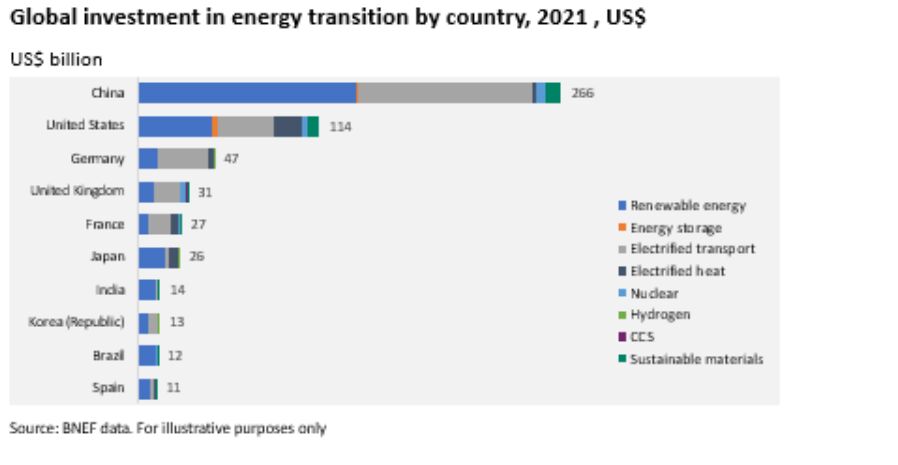 Die meisten Regierungen in Asien haben Netto-Null-Ziele für 2050 festgelegt, zudem ist Asien der weltweit größte Endmarkt für Elektrofahrzeuge, Solar- und Windkraftanlagen. Chinesische Firmen beherrschen den weltweiten Markt: Ihr Marktanteil liegt bei 91% im Solar-, 78% im Batterie- und 27% im Windkraftbereich.7