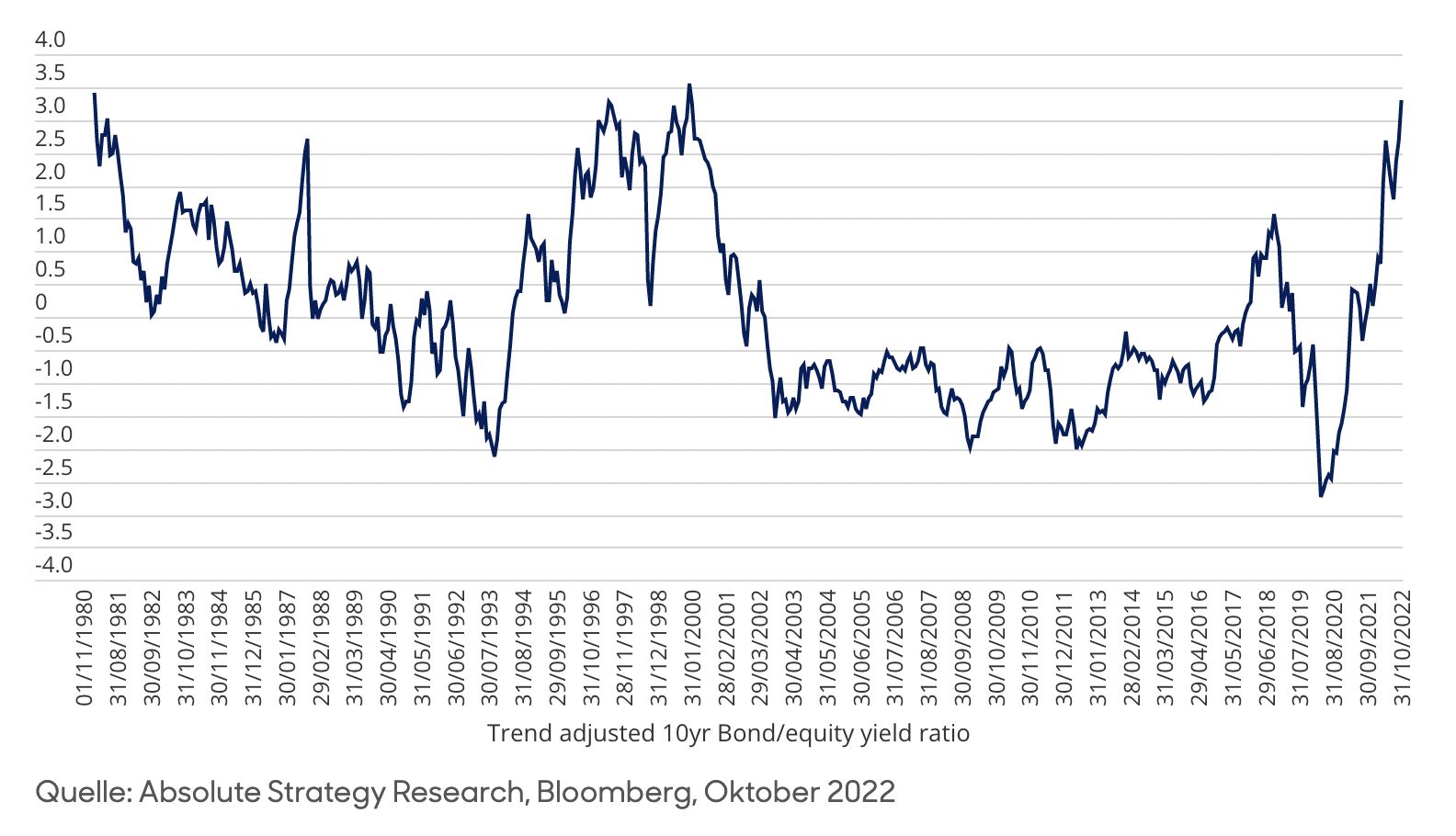Mit niedrigeren Zinsen ist wohl erst Ende 2023 oder Anfang 2024 zu rechnen. Aber die Finanzmärkte sind dafür bekannt, dass sie nach vorne schauen. Anleger werden diese Zinssenkungen schon lange vor der Bestätigung durch die Zentralbanken einpreisen. Ein solches Umfeld ist für Anleihen wesentlich günstiger. - Relative Bewertungen von Anleihen und Aktien. Nach einem turbulenten Jahr an den Finanzmärkten waren Anleihen verglichen mit Aktien so günstig wie seit dem Höhepunkt der Dotcom-Blase Ende der 1990er und Anfang der 2000er Jahre nicht mehr.