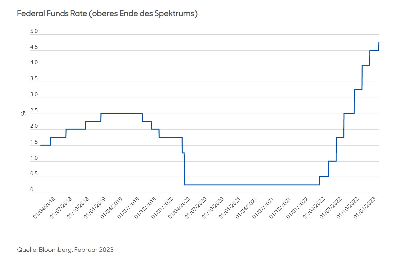 Wir sind der Ansicht, dass diese Anfälligkeiten in den kommenden Quartalen wieder deutlich zutage treten werden. Nehmen wir die USA als Beispiel: Die Federal Reserve begann im März des vergangenen Jahres damit, ihre Geldpolitik zu straffen. Dabei hob sie die Federal Funds Rate (FFR) von einem Rekordtief bei 0,25% auf eine Zielspanne von 4,5-4,75% am 1. Februar an. Der Markt geht aktuell davon aus, dass die FFR bis Mai auf rund 5% ansteigen wird.