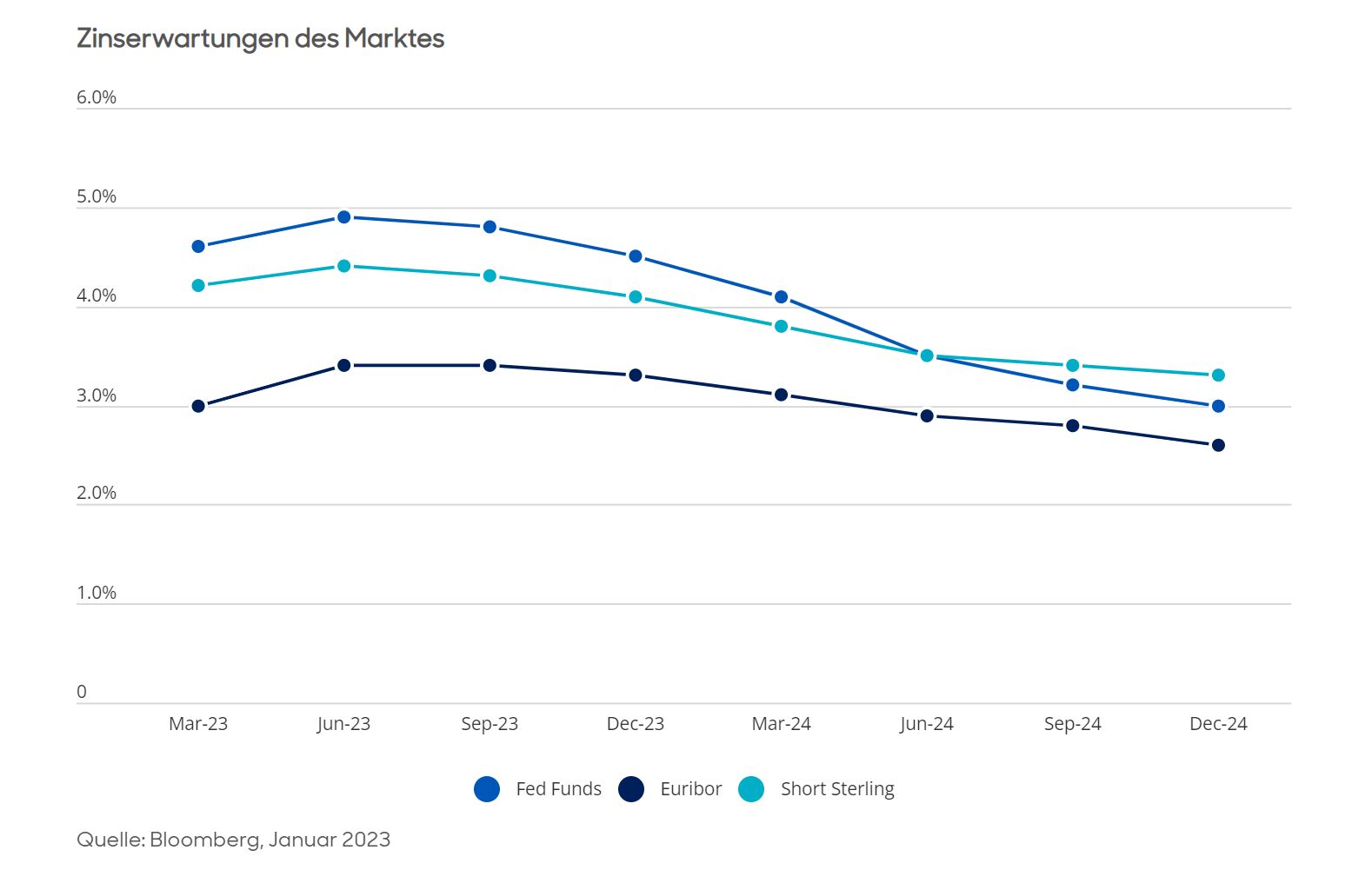 Im Zuge des nachlassenden Wirtschaftswachstums dürfte die Nachfrage nach Staatsanleihen steigen, da sich die Anleger zum Schutz in „sichere Häfen“ flüchten. In der Folge dürfte dann auch die Nachfrage nach Staatsanleihen mit kürzerer Laufzeit zunehmen, wenn die Zentralbanken eine Pause in ihrem Zinserhöhungszyklus signalisieren. Angesichts der erwarteten Entwicklung der Leitzinsen gehen wir davon aus, dass unser Appetit auf globale Staatsanleihen und unsere Duration 2023 stetig zunehmen werden.