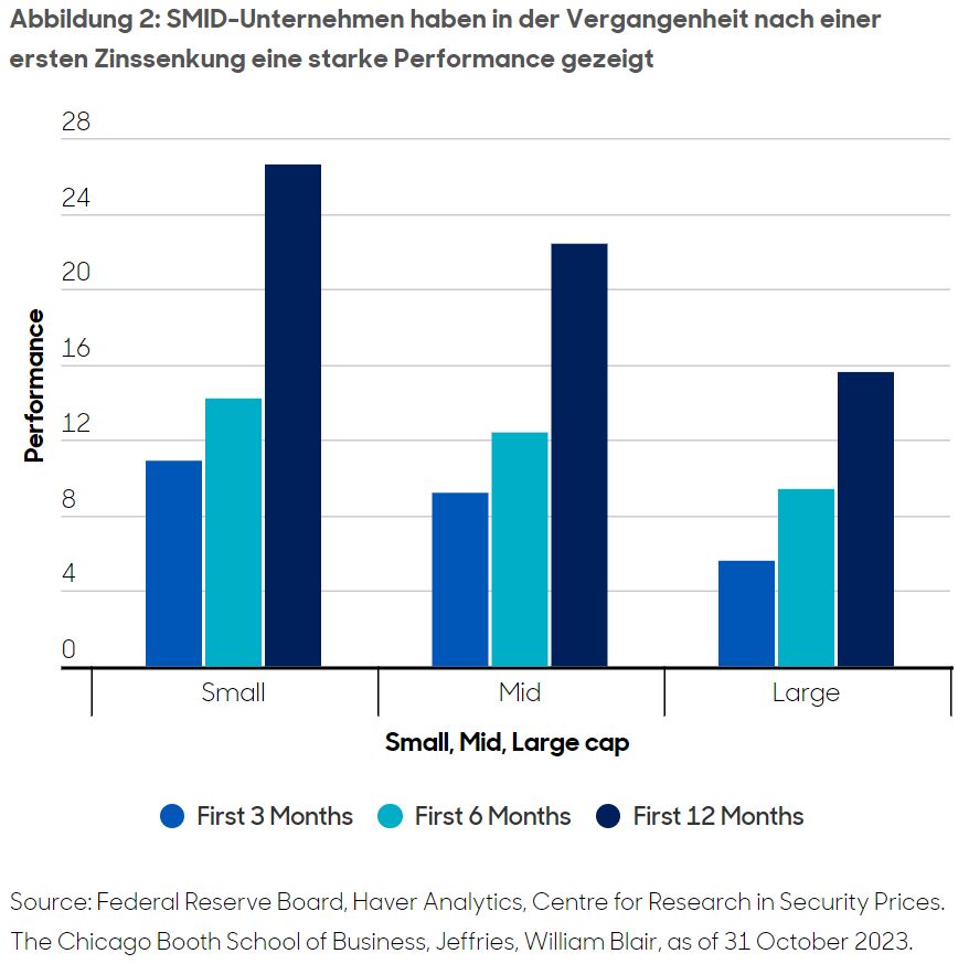 Die historischen Daten sprechen für sich. Unsere Tabelle zeigt die Performance von US-amerikanischen Small, Mid und Large Caps (SMIDs) drei, sechs und 12 Monate nach einer Zinssenkung. Die Outperformance ist eindeutig. Diese Daten beziehen sich zwar nur auf US-Aktien, aber wir glauben, dass es genügend Ähnlichkeiten mit ihren europäischen Pendants gibt, um ähnliche Schlussfolgerungen zu ziehen.