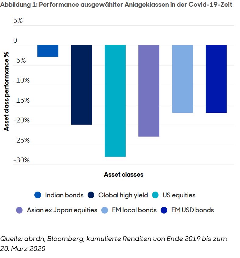 Ein weiterer Faktor ist die relativ bessere Performance indischer Anleihen in schwierigeren Marktumfeldern. So verlor der inländische Anleihenmarkt Indiens vom Jahresende 2019 bis zum Höhepunkt des Marktabverkaufs während der Covid-19-Krise am 20. März 2020 nur 3% (einschließlich der Auswirkungen von Wechselkursen). Wie unten dargestellt, übertraf diese Performance viele andere Anlageklassen deutlich.