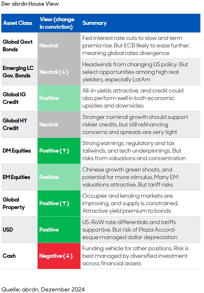 Der abrdn House View ist positiv in Bezug auf das Aktienrisiko und den Dollar, optimistischer hinsichtlich Immobilien und neutral mit Blick auf die meisten Rentenmärkte.