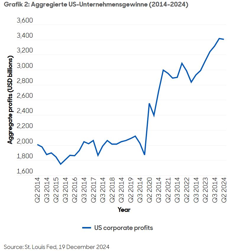 Ebenso sind die sicheren Cashflows von IG-Unternehmensanleihen an wichtige finanzielle Grundlagen gebunden, die derzeit stark und unterstützend sind. Dazu gehören günstige Indikatoren wie eine moderate Nettoverschuldung, eine hohe Zinsdeckung und starke Gewinnmargen. In den USA liegen die aggregierten Unternehmensgewinne (nach Steuern) immer noch in der Nähe von Rekordhöhen (Grafik 2).