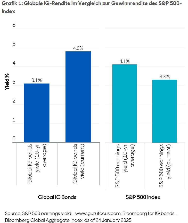 Der vielleicht dominierendste Faktor, der die globalen Anleihemärkte in den letzten Wochen beeinflusst hat, war die zweite Präsidentschaft von Donald Trump. Die Märkte befürchten, dass höhere Importzölle, strengere Einwanderungskontrollen und wachstumsfördernde Ausgaben zu einer höheren Inflation in den USA führen könnten. Dies wiederum hat zu einer deutlichen Reduzierung der Erwartungen an Zinssenkungen in den USA und zu höheren Renditen für US-Staatsanleihen geführt. Die Renditen zehnjähriger Staatsanleihen näherten sich wieder ihrem Höchststand von über 5,0% im Oktober 2023 an, was die Anleiherenditen, einschließlich der Investment-Grade-Anleihen (IG), schmälerte. Das Ausmaß der Renditeanstiege bedeutet jedoch, dass die mit Trump verbundenen Risiken nun wahrscheinlich eingepreist sind.