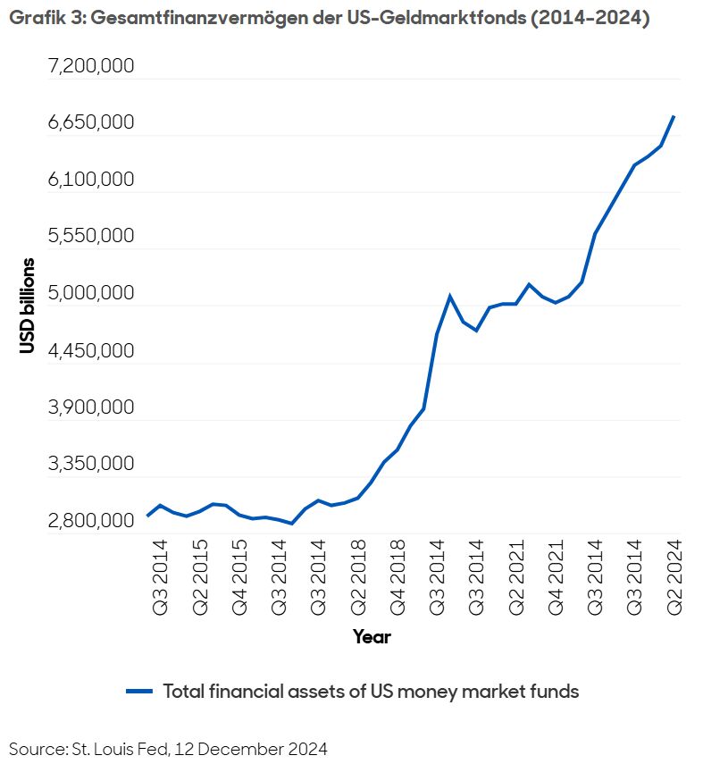 Die Fed erhöhte die Zinssätze von 0–0,25% Anfang 2022 auf 5,25–5,50% Mitte 2023, was dazu beitrug, enorme Zuflüsse in Geldmarktfonds anzuziehen. Bis zum Ende des dritten Quartals 2024 erreichte das Gesamtvermögen der US-Geldmarktfonds 6,8 Billionen US-Dollar, gegenüber 1,6 Billionen US-Dollar Ende 2022. Allerdings fallen die Geldmarktzinsen jetzt im Einklang mit den niedrigeren Zinssätzen. Daher glauben wir, dass die enormen Bargeldreserven, die an der Seitenlinie geparkt sind, in Risikoanlagen fließen könnten, insbesondere in relativ sichere IG-Anleihen.