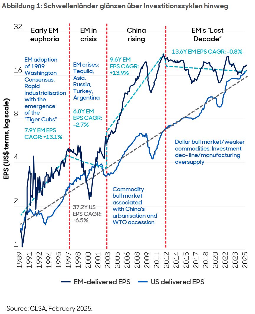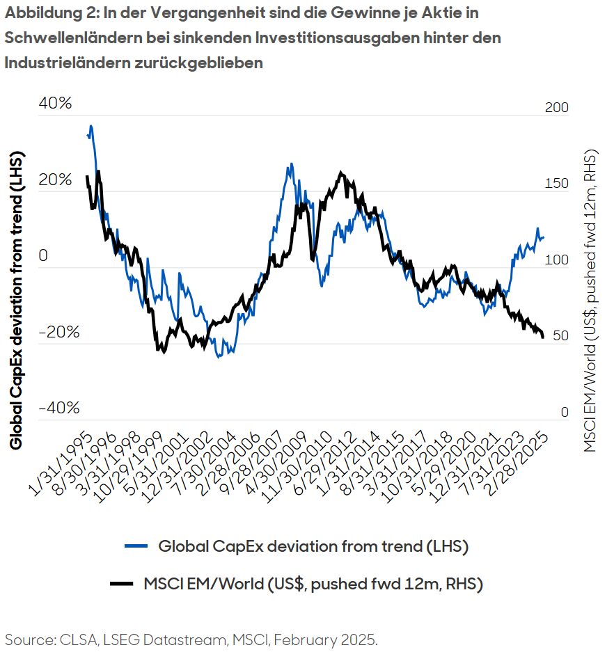 Die ersten Reaktionen auf Trumps Zölle waren eine Mischung aus Schock und Sorge. Abgesehen von den ersten negativen Überraschungen ist das langfristige Bild jedoch eher ermutigend. Die Umstrukturierung der Lieferketten wird beträchtliche Investitionen erfordern, von denen ein Großteil weiterhin nach Asien und in die Schwellenländer fließen wird. Die US-Kapitalmärkte scheinen die bevorzugte Finanzierungsquelle zu sein. Dieser Prozess wird Jahre dauern und erhebliche Investitionen in den USA erfordern, um die Wettbewerbsfähigkeit der Produktion zu verbessern. Der Erfolg ist alles andere als sicher. China ist eine beachtliche Wirtschaftsmacht und hat sich in den letzten sieben Jahren auf dieses Szenario vorbereitet. Schließlich können sich die Schwellenländer angesichts der Entkopplung der beiden größten Wirtschaftsmächte der Welt in eine vorteilhafte Position bringen.