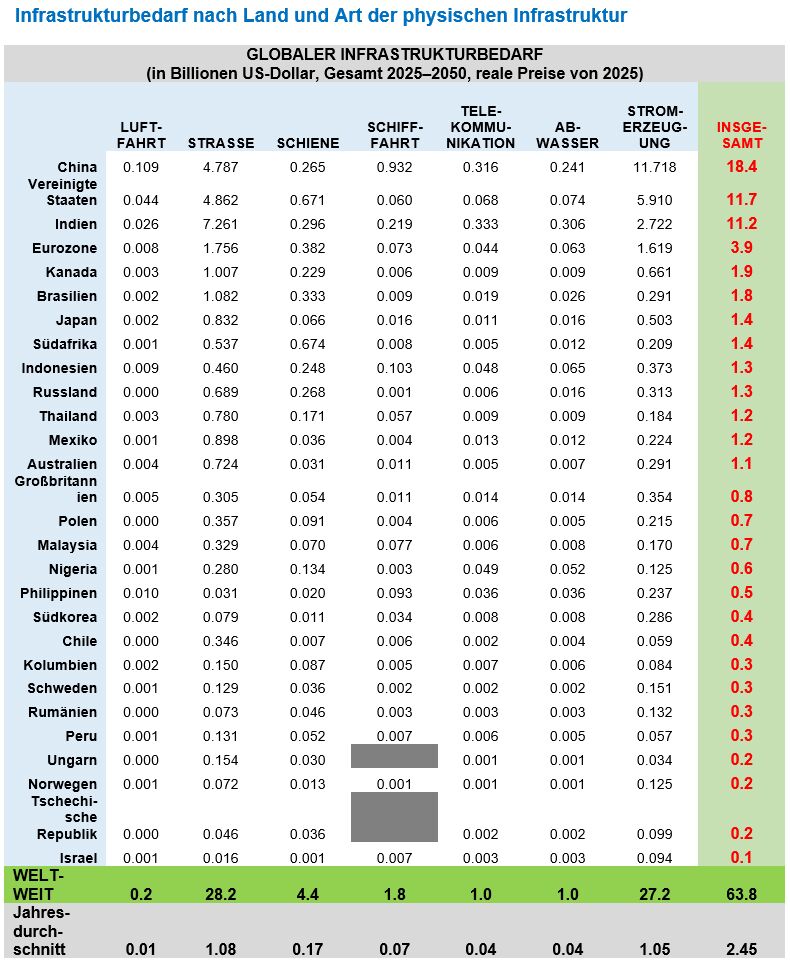 Dies entspricht 1,7% des weltweiten BIP pro Jahr und liegt fast zwei Drittel über den 39 Billionen US-Dollar, die zwischen 2000 und 2024 für Infrastrukturinvestitionen ausgegeben wurden.