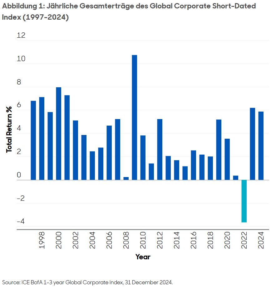 Kurzlaufende Anleihen haben sich als sehr stabil erwiesen: Der ICE BofA 1-3 Year Global Corporate Index verzeichnete in den letzten 28 Jahren nur ein einziges Jahr mit negativer Gesamtrendite (siehe Abbildung 1).