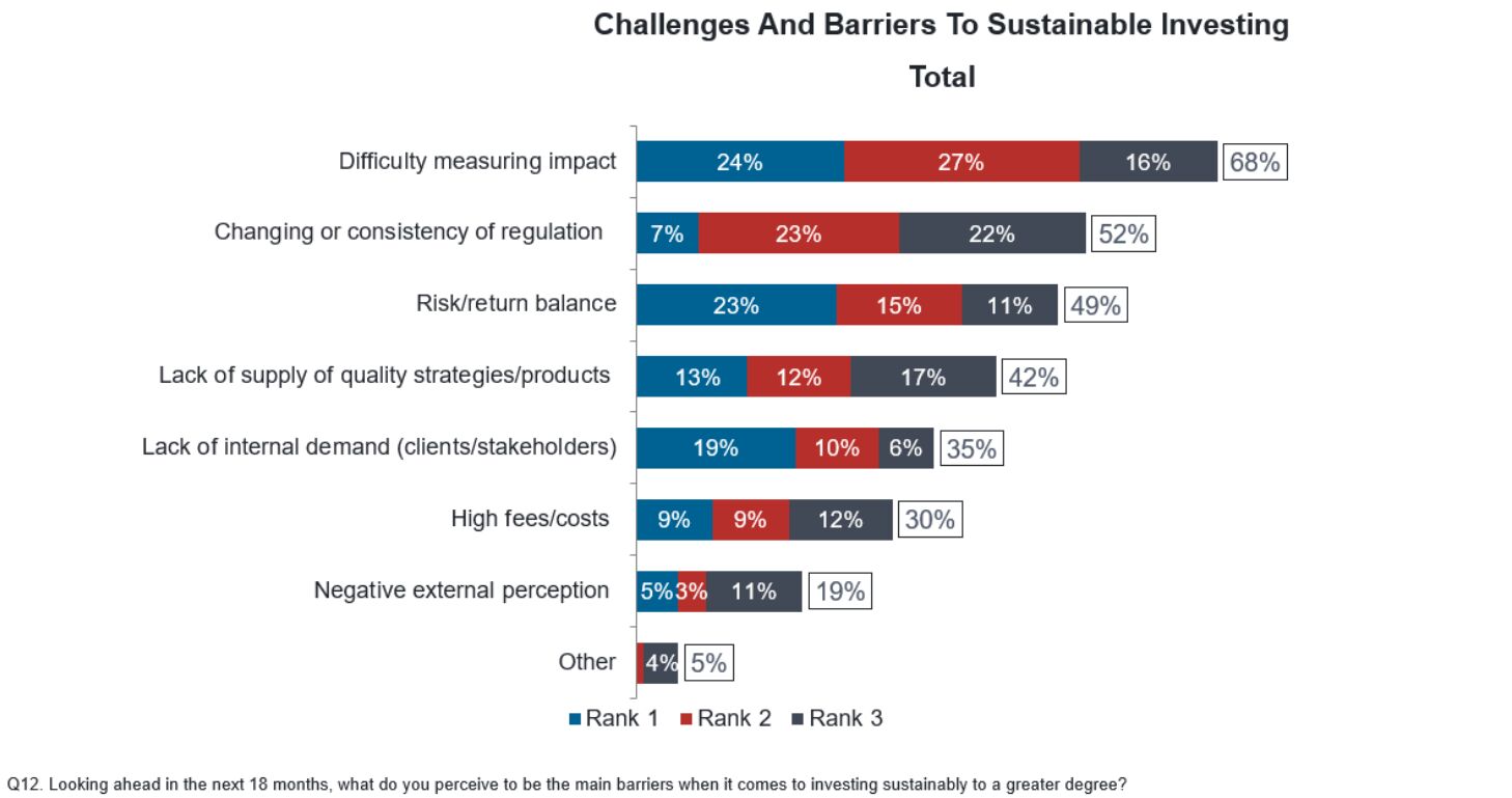 Obwohl ESG bei der Asset Allocation als wichtig angesehen wird, gibt es nach wie vor Hindernisse. Die Schwierigkeit, den Impact beziehungsweise die Auswirkungen zu messen, wird als größtes Hindernis für die weitere Einführung nachhaltiger Anlagen angesehen (insgesamt 68%). Zudem nannten 52% der Anleger Änderungen oder uneinheitliche Vorschriften als Haupthindernis. In Asien empfanden 66% der Anleger das mangelnde Angebot an hochwertigen Strategien/Produkten als Hindernis – verglichen mit nur 31% in Europa.