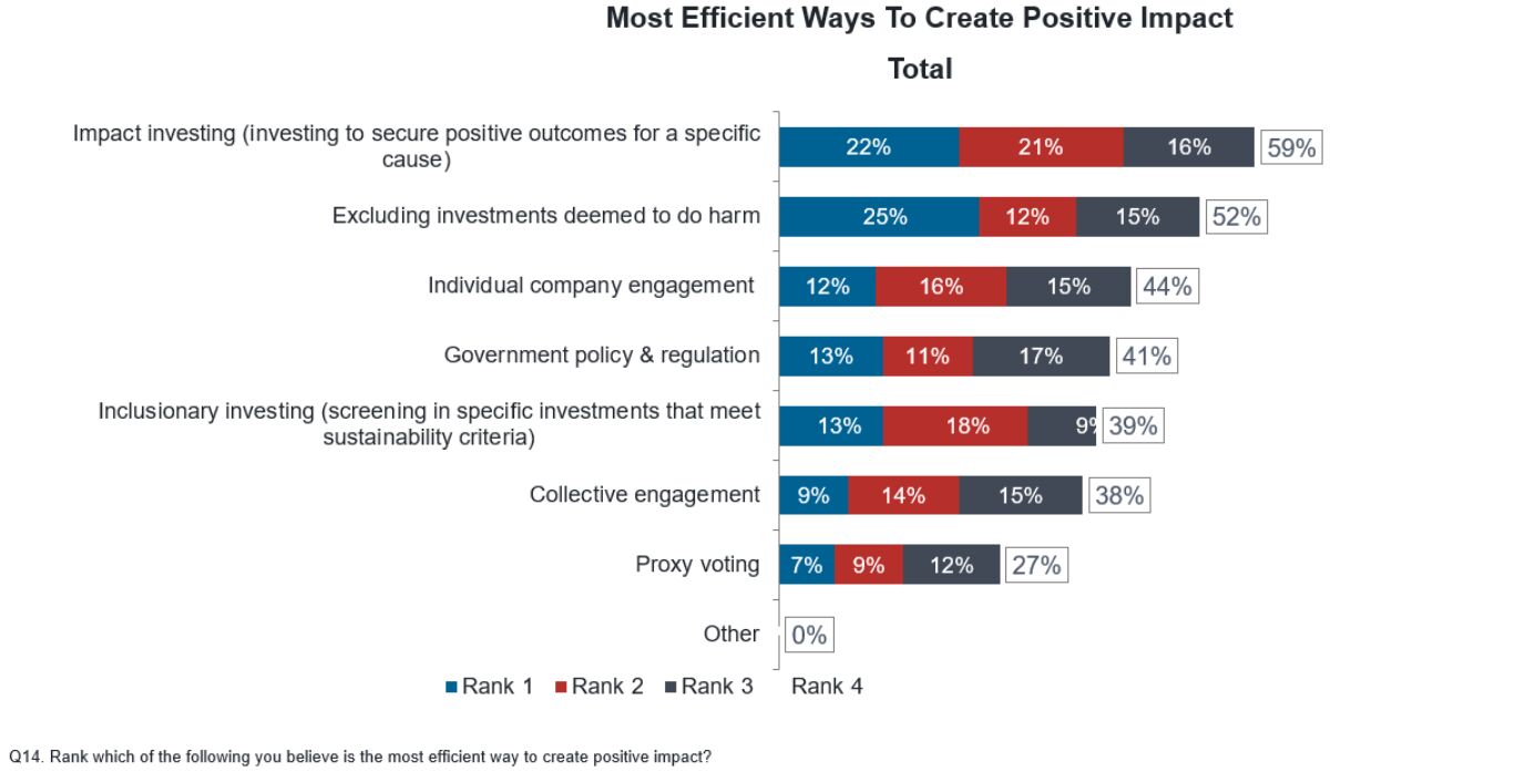 Auf die Frage, wie man am effizientesten eine positive Wirkung erzielen kann, nannten die Anleger eine Reihe von Möglichkeiten, darunter Impact Investing (59%), ausschließendes Screening (52%), individuelles Unternehmensengagement (44%) und staatliche Politik und Regulierung (44%).