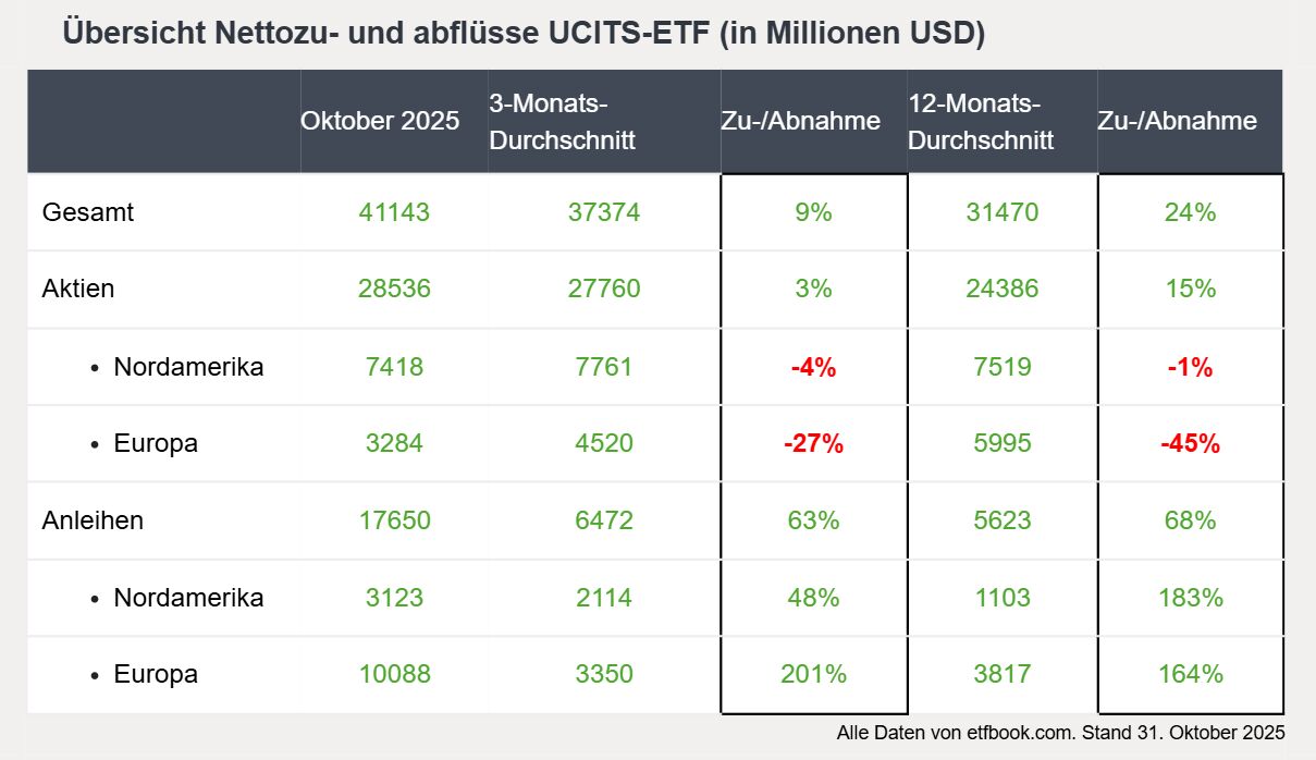 Nach Rekord-Zuflüssen im September bleibt der UCITS-ETF-Markt auch im Oktober auf Wachstumskurs. Insgesamt flossen über 38 Milliarden US-Dollar in ETFs, der zweitbeste Monat seit Beginn der Datenaufzeichnung. Während die Zuflüsse in Aktien-ETFs nur leicht über ihrem 3-Monats-Durchschnitt blieben, floss innerhalb eines Monats so viel Kapital in Anleihe-ETFs wie noch nie. Unternehmensanleiheprodukte profitierten am meisten. „Mehr Unternehmensanleihen, weniger Aktien - das heißt, ETF-Anleger suchen etwas weniger Risiko als zuletzt, wollen sich aber Renditechancen erhalten.”, sagt Stefan Kuhn, Head of ETF & Index Distribution, Europe bei Fidelity International.