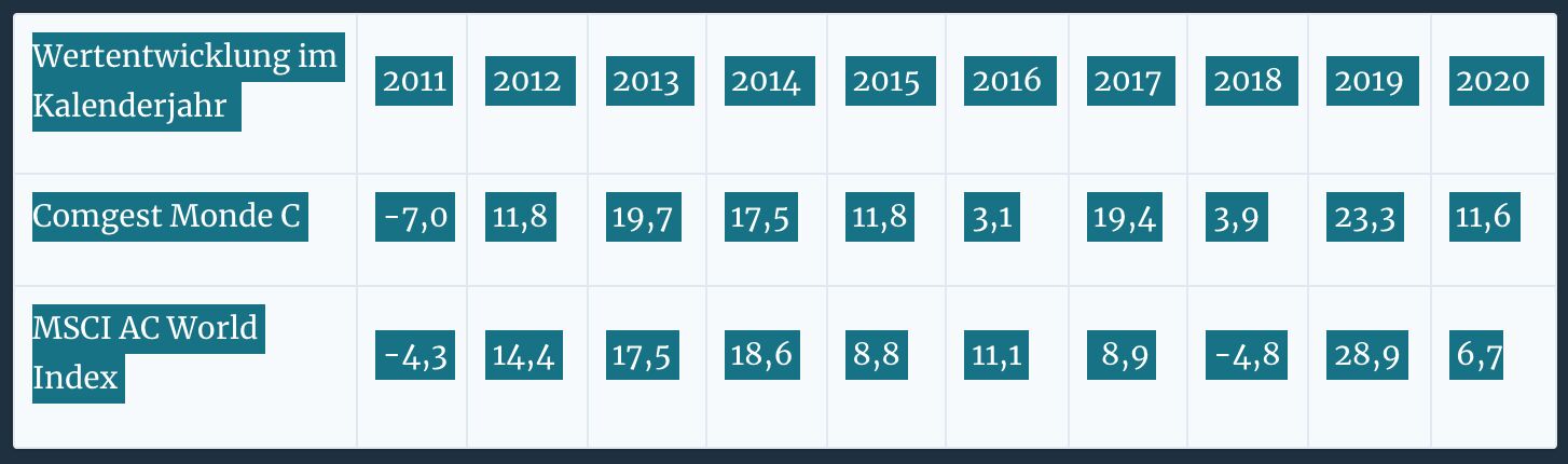 „In den letzten 30 Jahren war unsere langfristige Anlagedisziplin bei Qualitätswachstum der Schlüssel zum Erfolg auf dem globalen Aktienmarkt. Die Aktienauswahl war die wichtigste und zuverlässigste Quelle, um Alpha für unsere Kunden zu erzielen. Auch die ESG-Analyse und -Integration haben sich als unschätzbare Ergänzung unseres Anlageprozesses erwiesen und unser Gespür für die Vermeidung langfristiger Risiken geschärft. So konnte die Downside-Capture des Comgest Monde seit 1991 mit durchschnittlich 62 Prozent konstant niedrig gehalten werden. Das hat zu einer jährlichen Outperformance von 3 Prozent und der geringsten Volatilität im Wettbewerbsvergleich geführt“, betont Laure Négiar.
