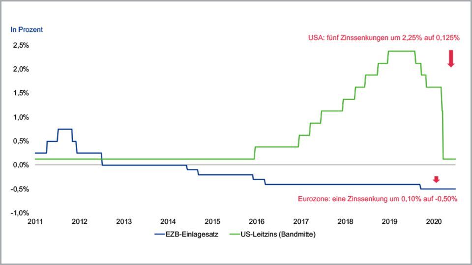 Leitzinsen der Zentralbanken in den USA und der Eurozone