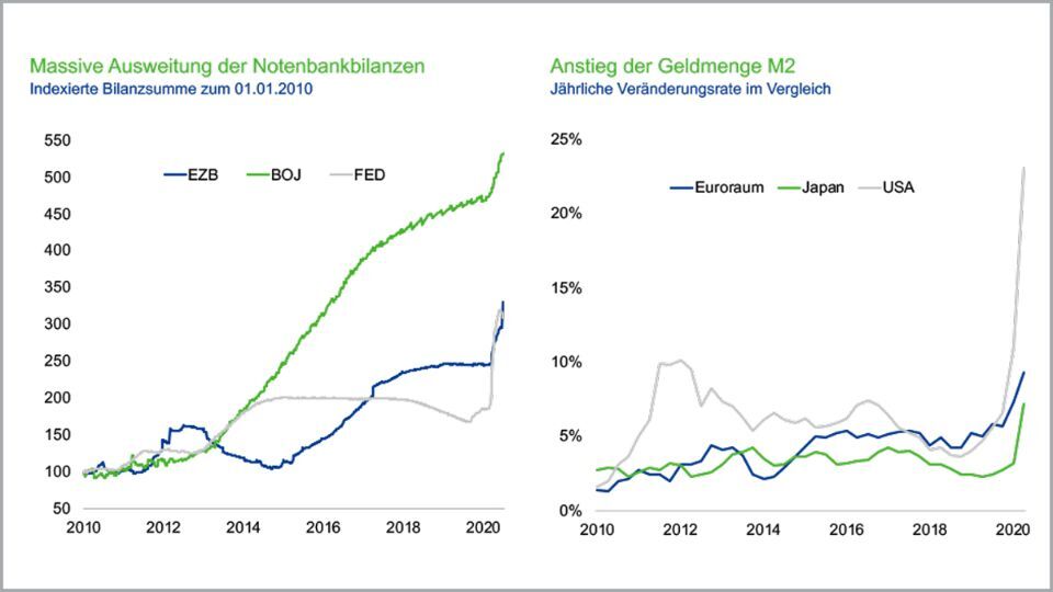 Durch die verschiedenen Maßnahmen, die alle noch ausgeweitet werden könnten – sei es volumenmäßig, aber auch durch Einbezug neuer Assetklassen wie Aktien –, ist die Notenbankbilanz der Fed deutlich gestiegen. Seit dem Jahr 2010 hat sich die Fed-Bilanz damit inzwischen ähnlich dynamisch wie jene der EZB ausgeweitet (vgl. Grafik).