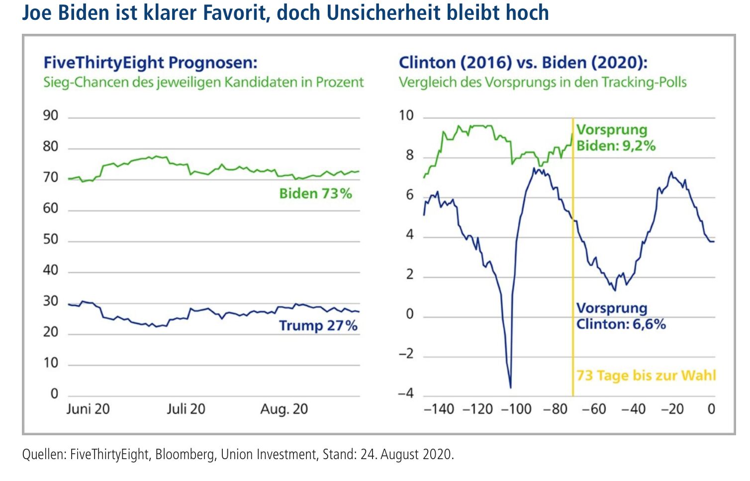 Aktien: Korrektur als Kaufgelegenheit.Eine verbreitete Sorge ist, dass ein Wahlsieg Bidens die Ertragskraft von „Corporate America“ belastet. Diese Befürchtung ist grundsätzlich nicht unbegründet. Das demokratische Wahlprogramm hat einige Härten für US-Unternehmen. Andererseits ist das geplante Investitionspaket über rund 2,4 Billionen US-Dollar sehr umfassend und innovationsorientiert. Im ersten Reflex belastet ein Wahlsieg Bidens und ein „democratic sweep“ wohl den Aktienmarkt. Langfristig könnte er vom höheren Wachstumspotenzial der US-Wirtschaft und konsumstärkenden Lohnsteigerungen profitieren. Auch dürfte unter einem Präsidenten Biden die Handels-Rhetorik weniger harsch und die US-Außenpolitik diplomatischer sein. Fazit: Eine Aktienmarktkorrektur nach einem Sieg Bidens könnte eine Kaufgelegenheit sein.
