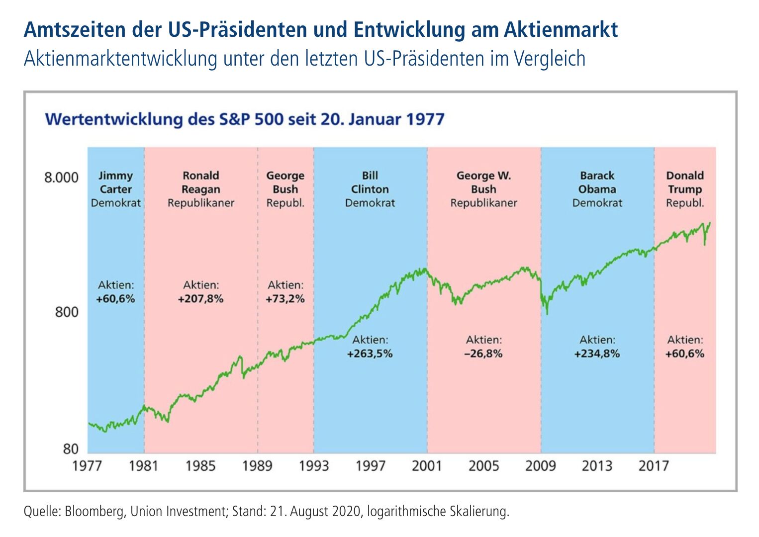 In Summe dürften jedoch die positiven Punkte von Bidens Agenda überwiegen: Handels-Rhetorik und US-Außenpolitik sollten weniger harsch sein als unter Trump, der in einer zweiten Amtszeit keine Rücksicht mehr auf seine Wiederwahl nehmen müsste. Bidens Vorschläge zu Infrastrukturausgaben und Löhnen sind zudem wachstumsfördernd, während Trumps Wirtschaftspläne eher konservierend sind. Im historischen Vergleich zeigt sich, dass unter demokratischen US-Präsidenten die Aktienmarktentwicklung im Median besser war als unter republikanischen (vgl. Grafik), wenngleich für die Kursentwicklung natürlich eine Vielzahl von Einflussfaktoren eine Rolle spielen. Die verbreiteten Sorgen von Aktieninvestoren vor demokratischen US-Präsidenten könnten sich somit als übertrieben herausstellen.