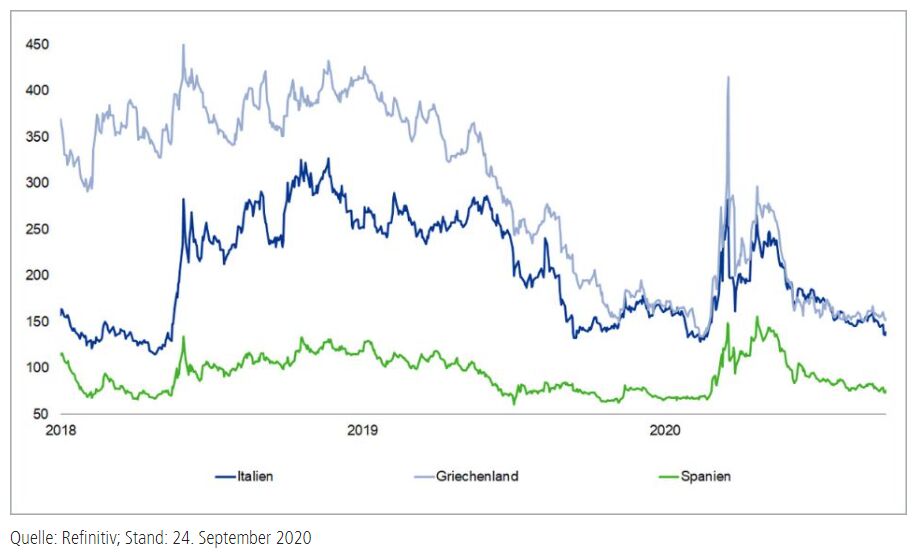 Vor einem halben Jahr war Italien das Epizentrum der Corona-Pandemie in Europa und das große Sorgenkind am Kapitalmarkt. Heute sind die Corona-Neuinfektionszahlen vergleichsweise niedrig. Und am Kapitalmarkt fiel die Rendite der dreißigjährigen italienischen Papiere (Buoni del Tesoro Poliennali, BTP) zur Wochenmitte auf ein Rekordtief. Die Rendite zehnjähriger BTP sank mit rund 0,83 Prozent immerhin noch auf den niedrigsten Stand seit September 2019. Dies strahlte auf andere Euro-Peripheriemärkte aus. Zehnjährige Staatsanleihen aus Spanien und Portugal rentierten so niedrig wie nie seit März, jene aus Griechenland erreichten den tiefsten Stand seit Februar. Worauf ist diese Entspannung zurückführen, wo doch steigende Neuinfektionszahlen zu einer größeren Risikoscheu unter Investoren sorgten und Risikoanlagen wie Aktien unter Druck gerieten?