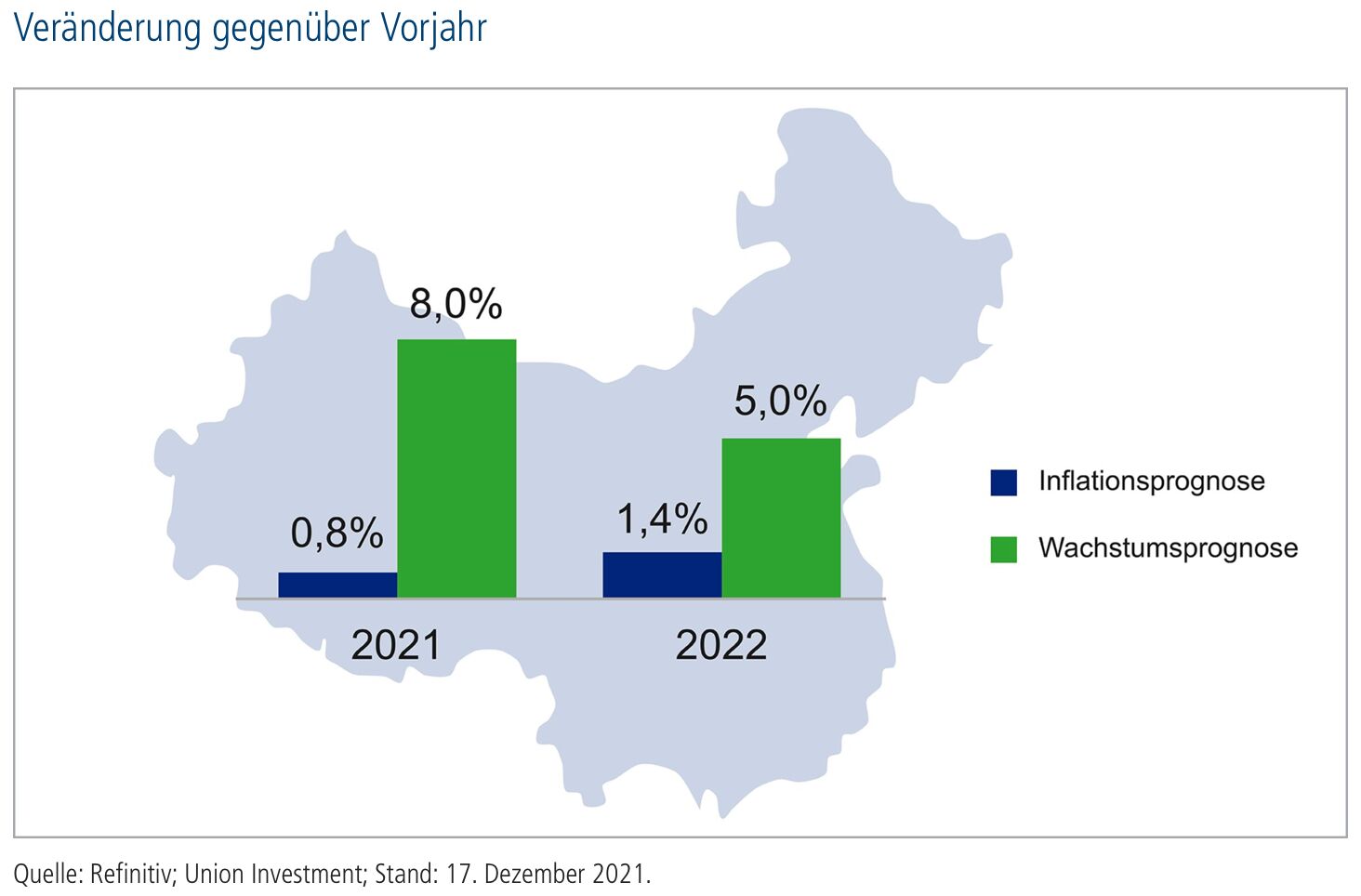 Allerdings erwarten die Ökonomen von Union Investment nicht, dass die Volksrepublik an Wachstumsraten wie vor der Pandemie üblich in Höhe von rund sechs Prozent anknüpfen wird. Dafür ist die Wirtschaft schlicht zu groß, die Ausgangsbasis zu hoch geworden, um noch in diesem Tempo wachsen zu können. Konkret erwarten die Volkswirte von Union Investment für das Jahr 2022 ein Wachstum des Bruttoinlandsprodukts (BIP) in Höhe von rund fünf Prozent – damit liegen sie im Mittelfeld der Broker-Schätzungen.