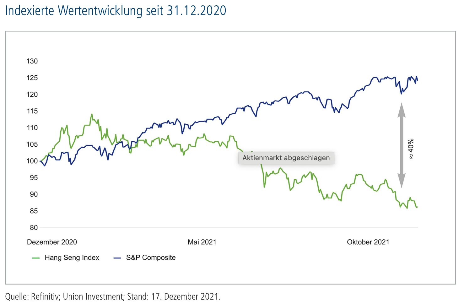 Aktienseitig sind die Kurse 2021 unter Druck geraten, insbesondere im Technologie-Sektor. In der Vergangenheit zeigte sich stets eine Neubewertung bei zunehmender Unterstützung von Fiskal- und Geldpolitik. Da im nächsten Jahr diese Impulse aber geringer als früher ausfallen dürften, bleibt abzuwarten, ob dies erneut eintritt. Angesichts der gedämpften konjunkturellen Dynamik dürfte die Gewinnentwicklung der Unternehmen im ersten Halbjahr 2022 zunächst schwach bleiben. Nach wie vor muss in der Titelauswahl auf mögliche regulatorische Einflussfaktoren geachtet werden. In Bezug auf einzelne Branchen bleibt der Technologiesektor stark risikobehaftet. Unternehmen mit besseren regulatorischen Perspektiven finden sich dagegen in der Erneuerbaren Energie, in Elektromobilität oder Batterieherstellung.