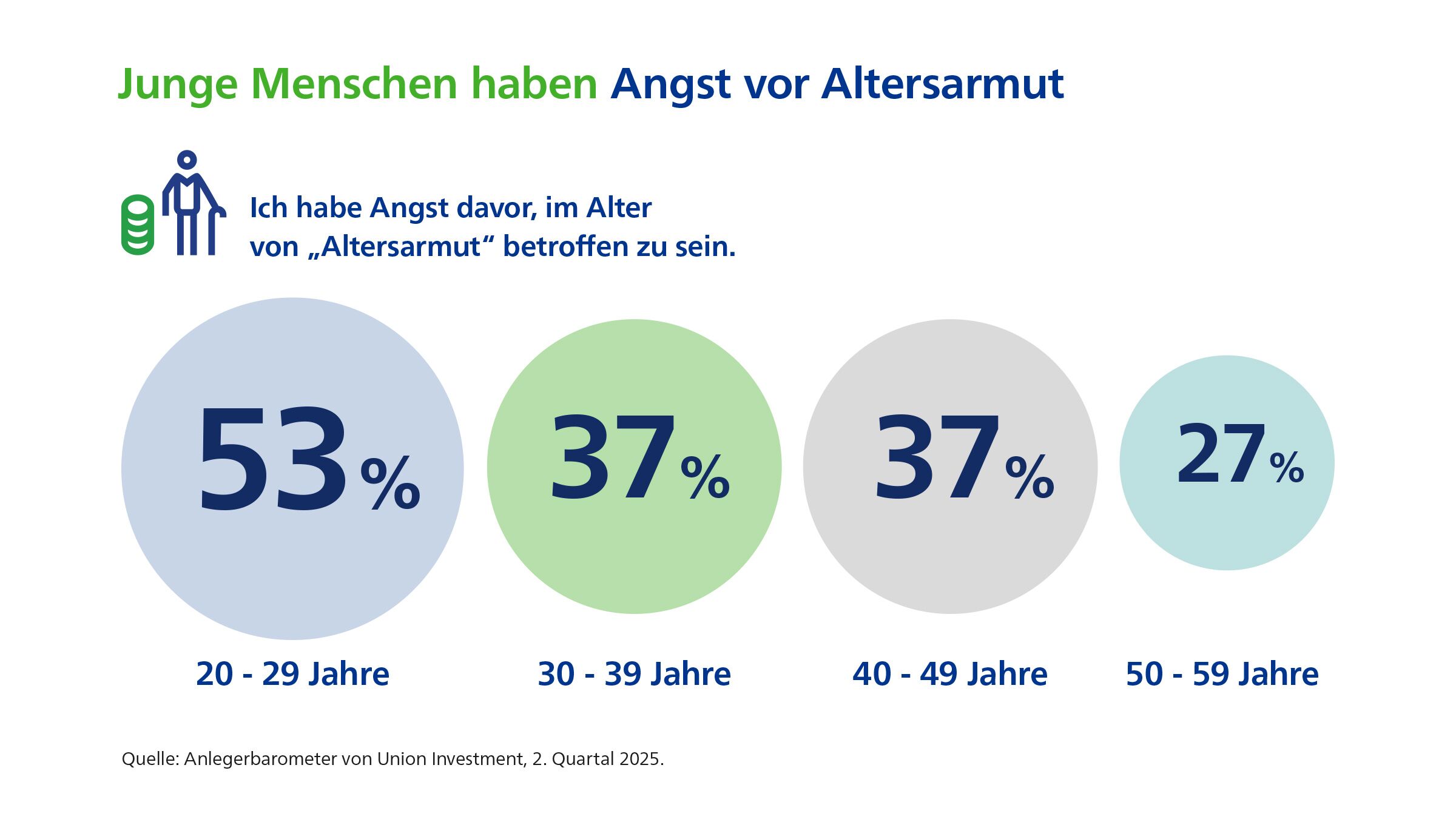 Eine aktuelle Umfrage im Rahmen des Anlegerbarometers von Union Investment zeigt alarmierende Trends in der Altersvorsorge vor allem unter jungen Menschen: Insbesondere 20- bis 29-Jährige fürchten sich verstärkt vor Altersarmut und glauben nicht, dass sie finanziell gut für das Alter vorgesorgt haben. Die Ergebnisse basieren auf einer repräsentativen Online-Befragung von 1.006 Personen in Deutschland, die in privaten Haushalten über Finanzen entscheiden.